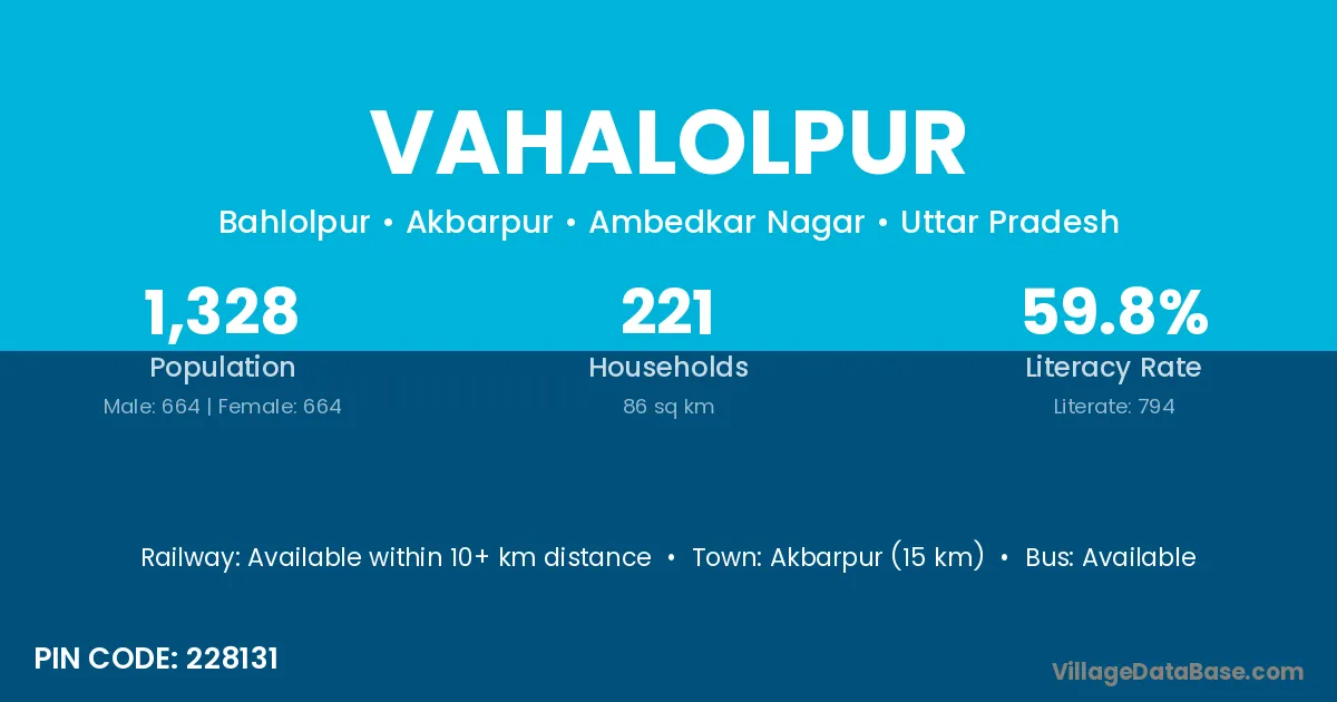 Akbarpur (15 km) is the nearest town to Vahalolpur village for major economic activities and is located approximately 15 km away.