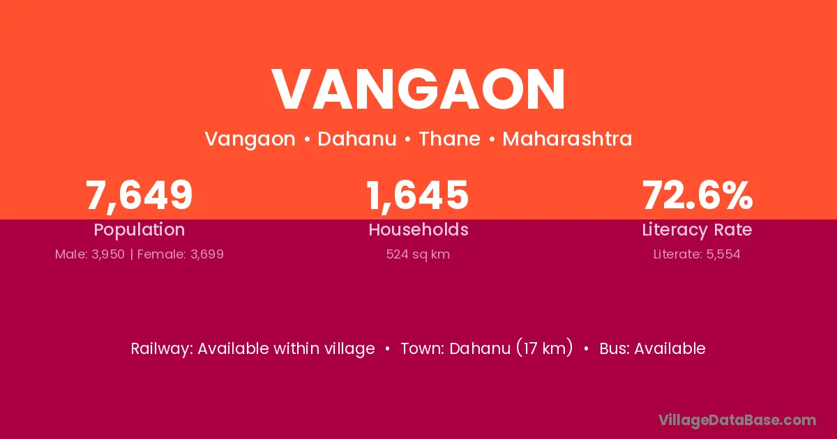 Vangaon village has a total population of 3,478 people, of which 1,645 are males and 1,833 are females.