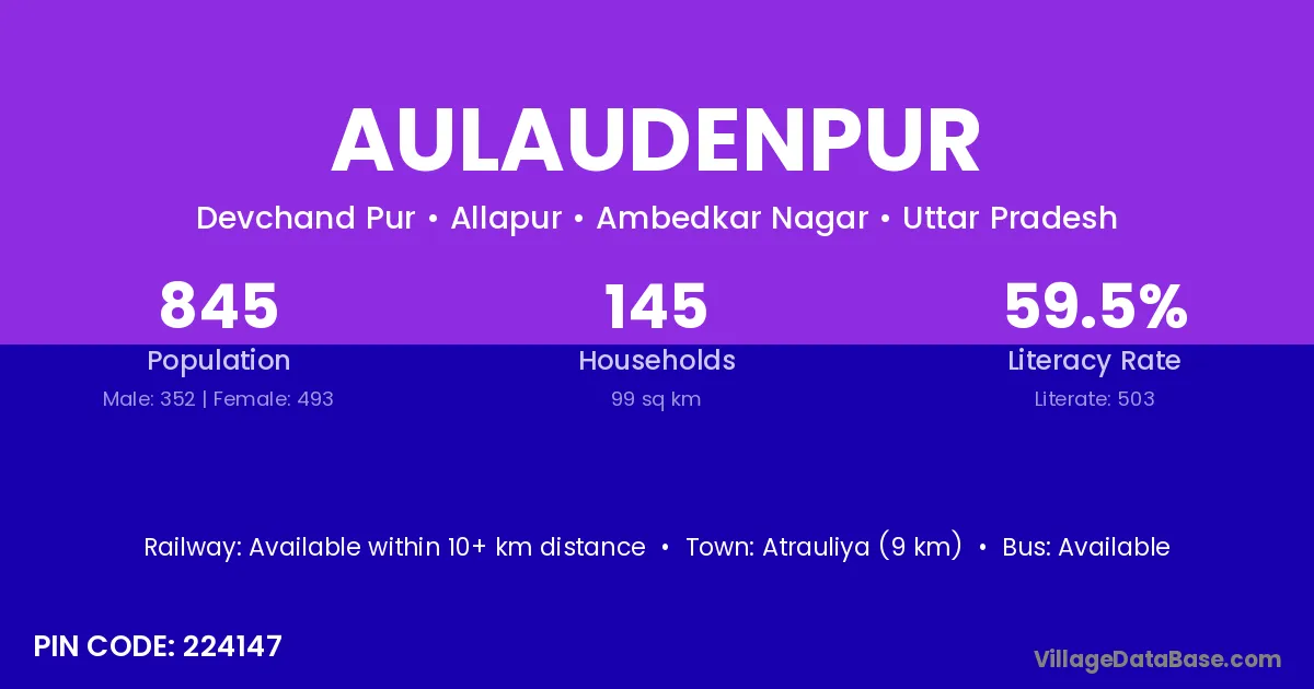 Atrauliya (9 km) is the nearest town to Aulaudenpur village for major economic activities and is located approximately 9 km away.