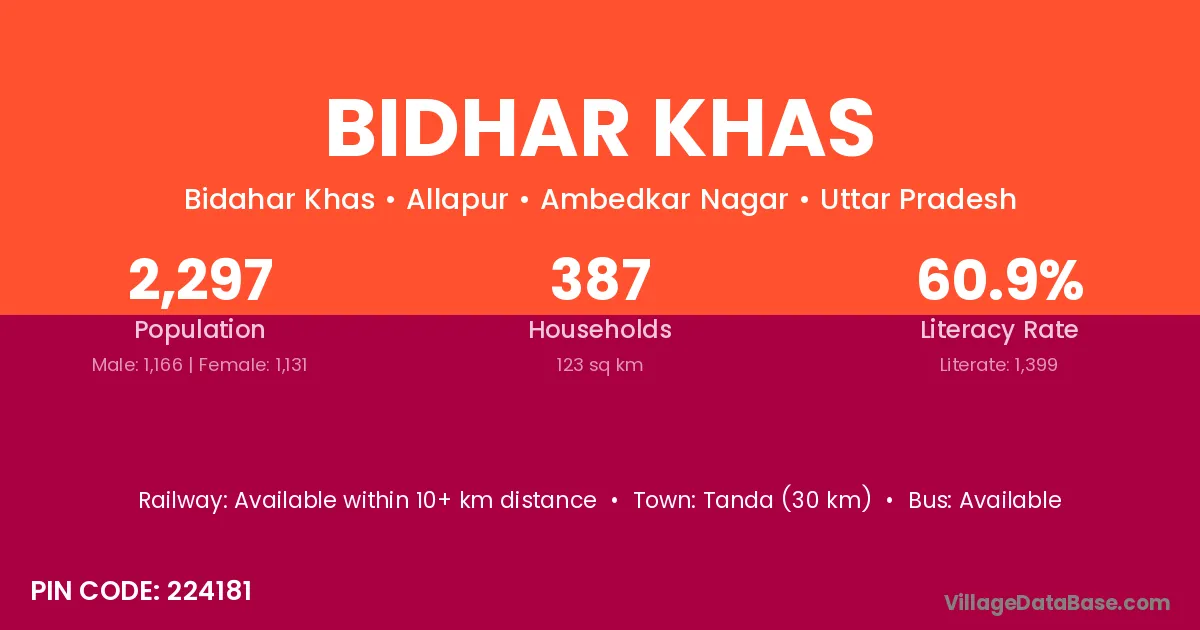 Tanda (30 km) is the nearest town to Bidhar Khas village for major economic activities and is located approximately 30 km away.