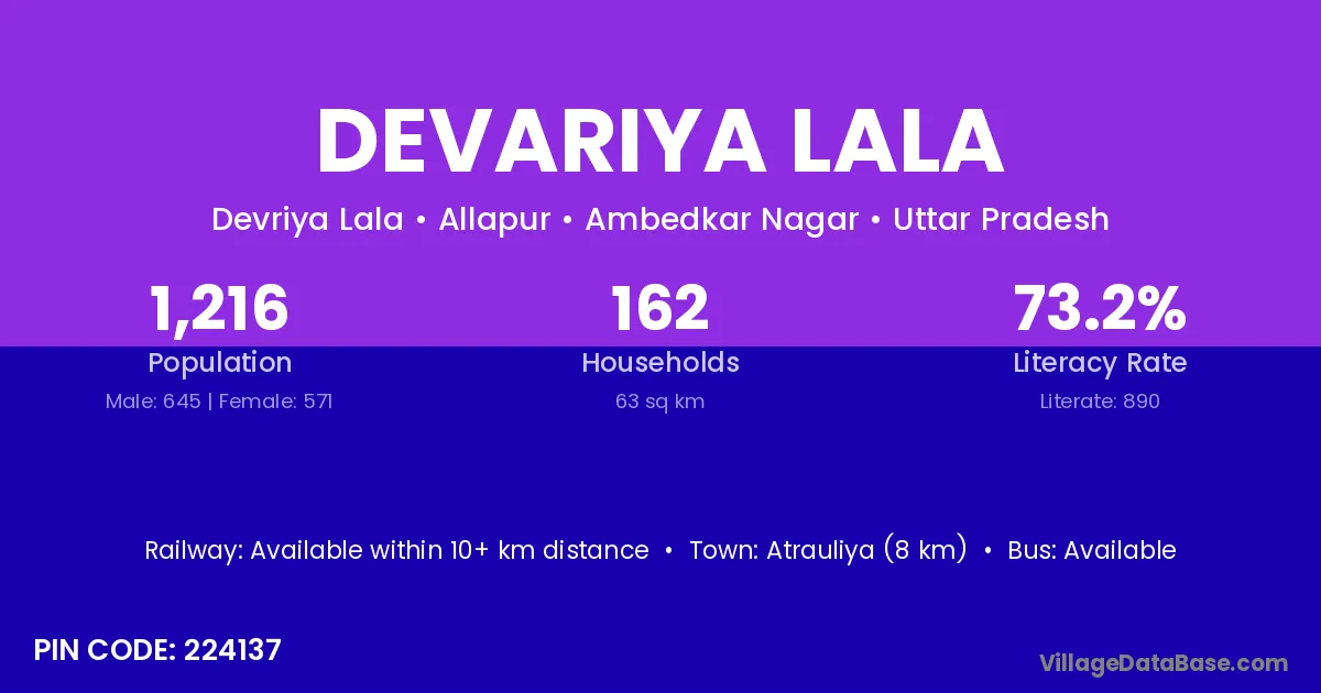 Devariya Lala village has a total population of 1,216 people, of which 645 are males and 571 are females.