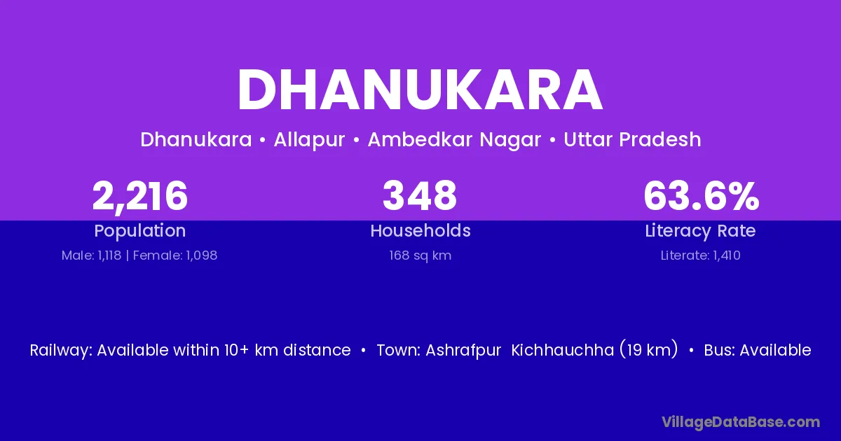 Ashrafpur Kichhauchha (19 km) is the nearest town to Dhanukara village for major economic activities and is located approximately 19 km away.
