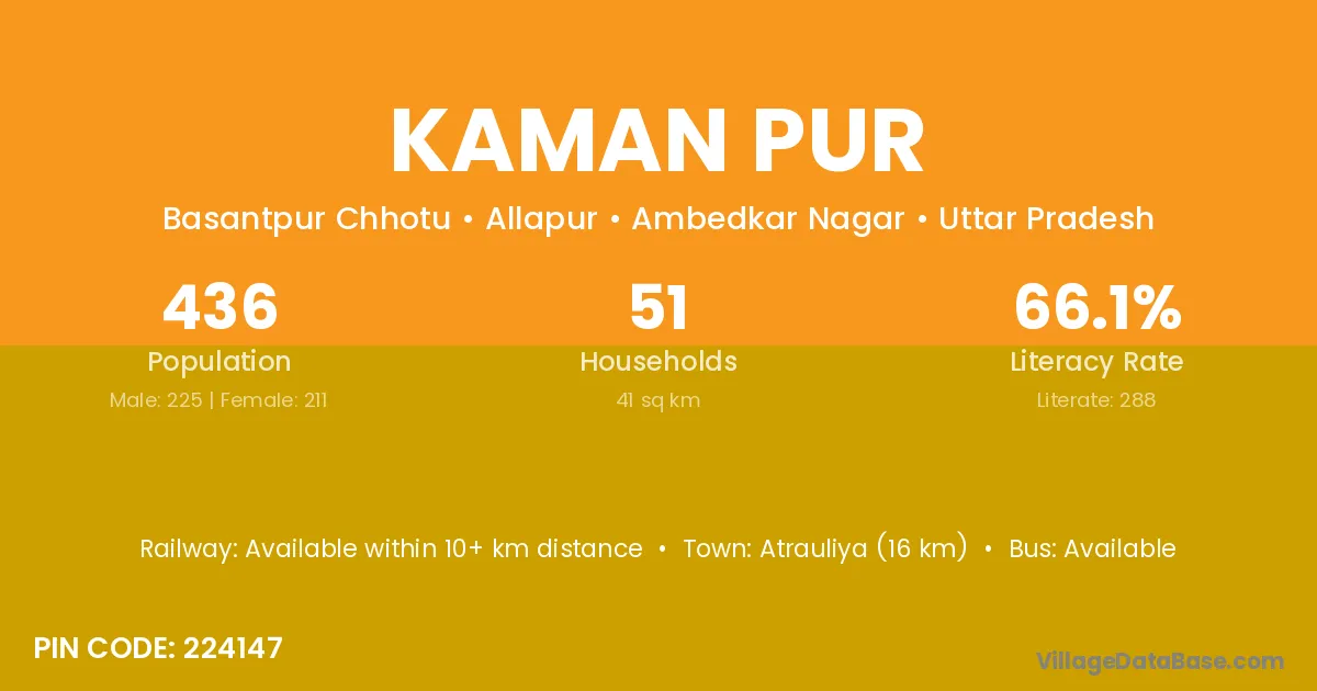 Kaman Pur village has a total population of 436 people, of which 225 are males and 211 are females.