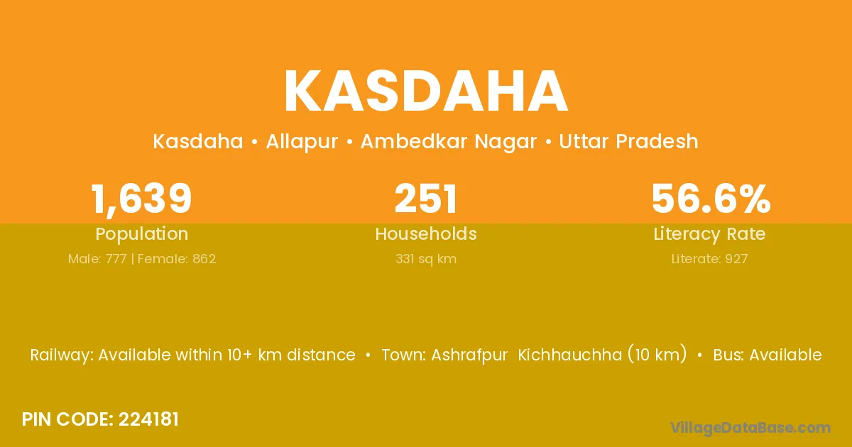 Ashrafpur Kichhauchha (10 km) is the nearest town to Kasdaha village for major economic activities and is located approximately 10 km away.