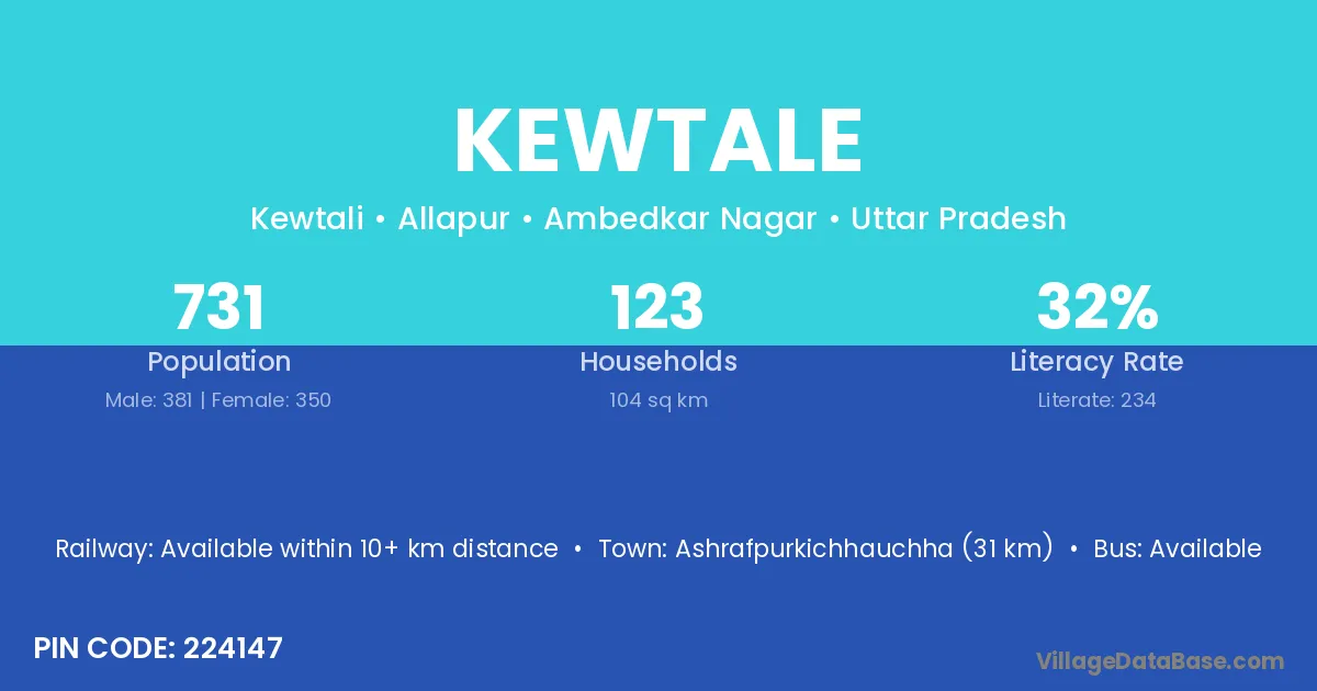 Ashrafpurkichhauchha (31 km) is the nearest town to Kewtale village for major economic activities and is located approximately 31 km away.