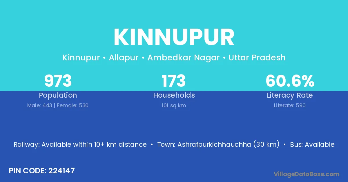 Ashrafpurkichhauchha (30 km) is the nearest town to Kinnupur village for major economic activities and is located approximately 30 km away.
