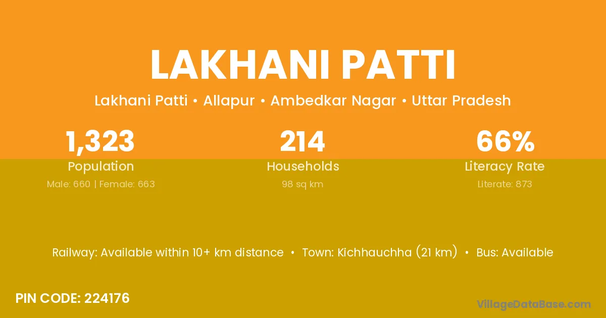 Lakhani Patti village has a total population of 1,323 people, of which 660 are males and 663 are females.