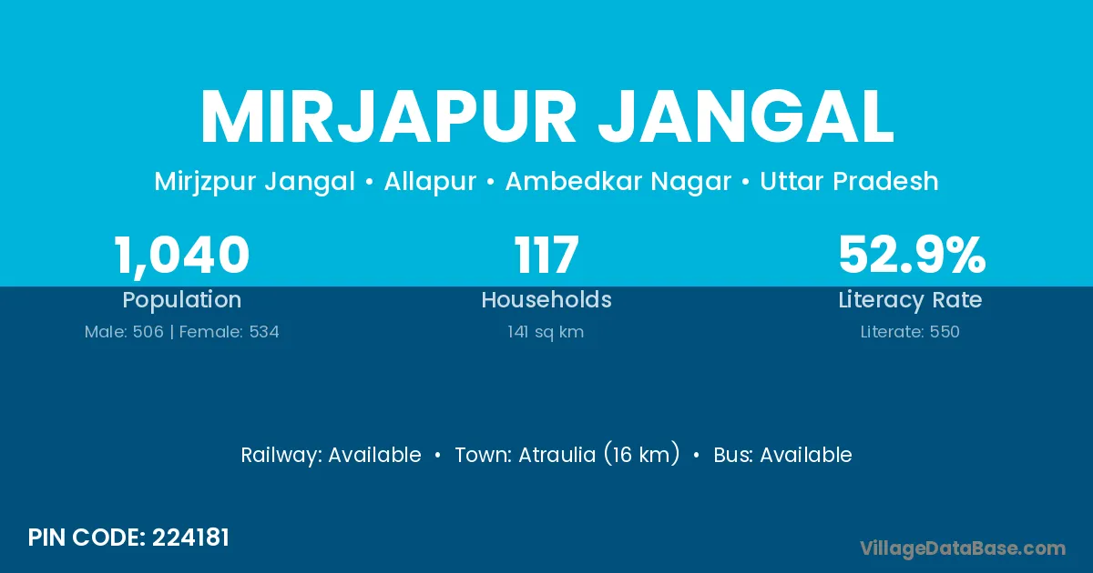 Atraulia (16 km) is the nearest town to Mirjapur Jangal village for major economic activities and is located approximately 16 km away.