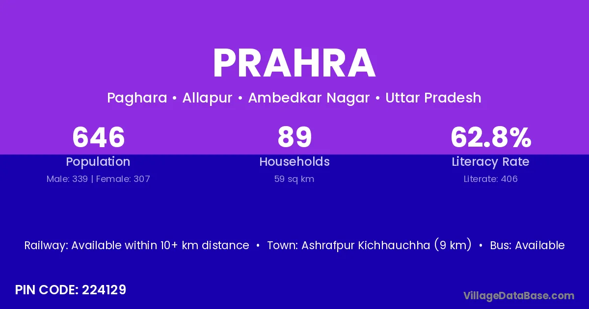 Ashrafpur Kichhauchha (9 km) is the nearest town to Prahra village for major economic activities and is located approximately 9 km away.