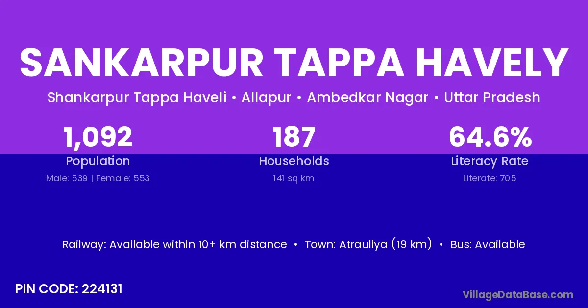 Sankarpur Tappa Havely village has a total population of 1,092 people, of which 539 are males and 553 are females.