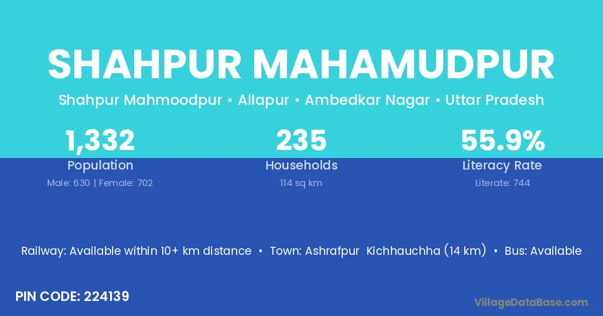 Ashrafpur Kichhauchha (14 km) is the nearest town to Shahpur Mahamudpur village for major economic activities and is located approximately 14 km away.