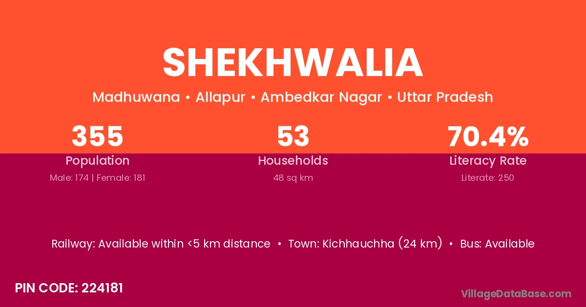 Shekhwalia village has a total population of 355 people, of which 174 are males and 181 are females.