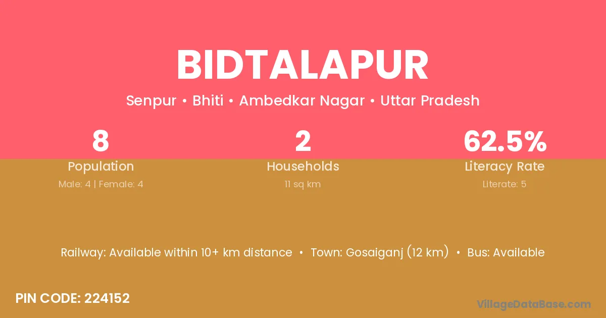 Bidtalapur village has a total population of 8 people, of which 4 are males and 4 are females.