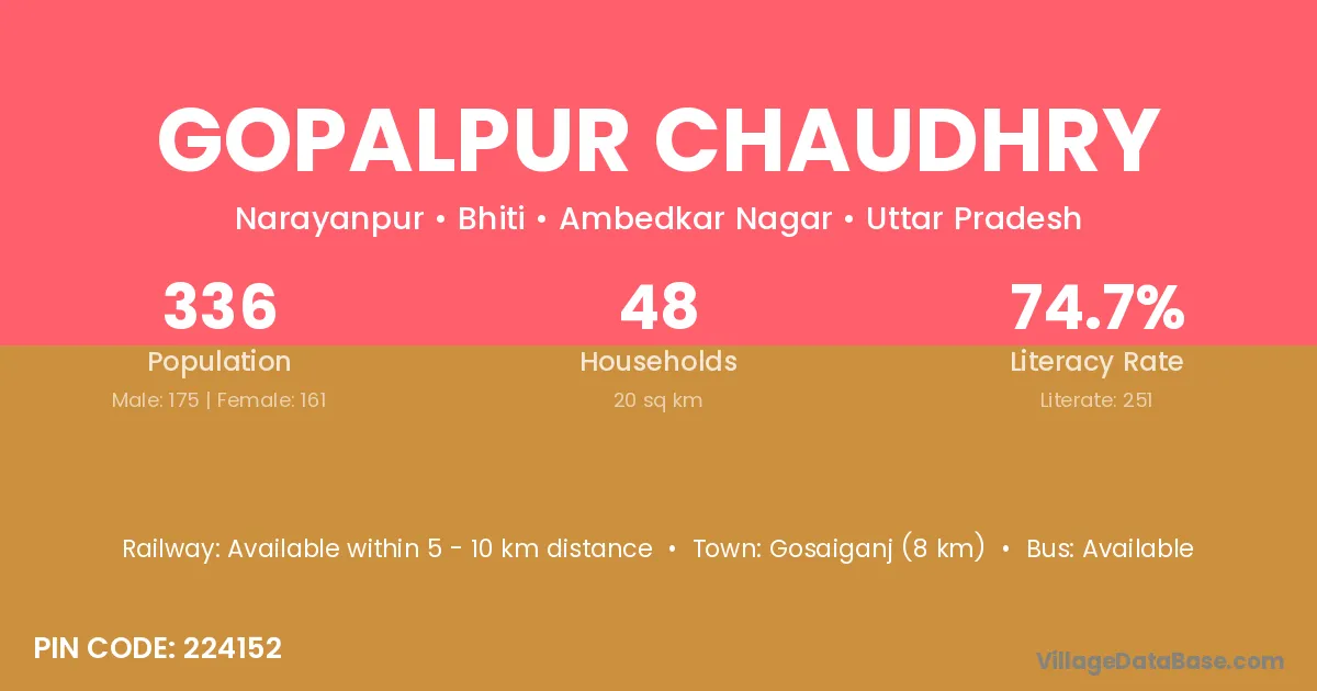 Gosaiganj (8 km) is the nearest town to Gopalpur Chaudhry village for major economic activities and is located approximately 8 km away.