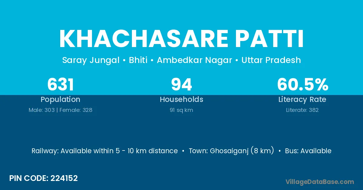 Khachasare Patti village has a total population of 631 people, of which 303 are males and 328 are females.