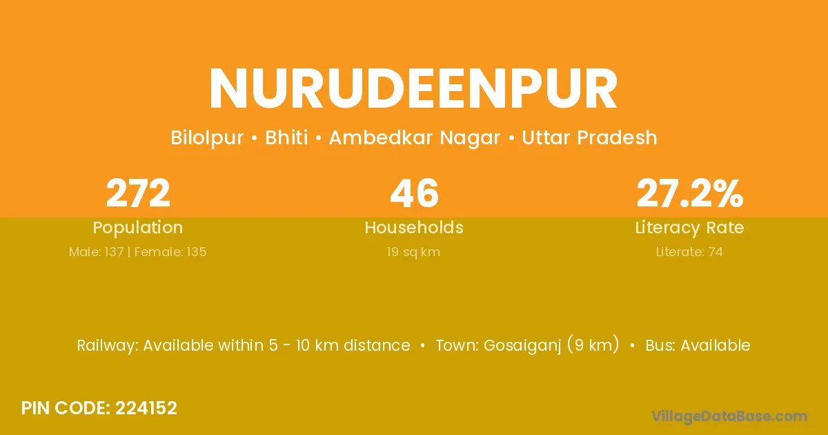 Nurudeenpur village has a total population of 272 people, of which 137 are males and 135 are females.