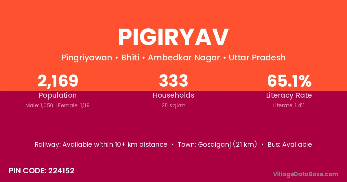 Gosaiganj (21 km) is the nearest town to Pigiryav village for major economic activities and is located approximately 21 km away.