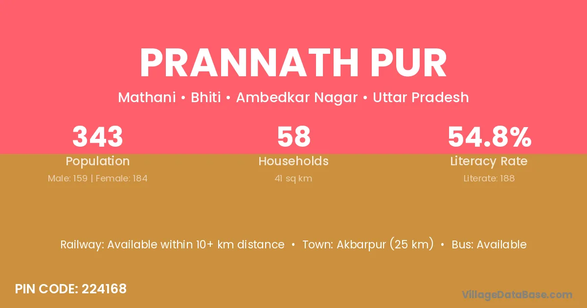 Akbarpur (25 km) is the nearest town to Prannath Pur village for major economic activities and is located approximately 25 km away.