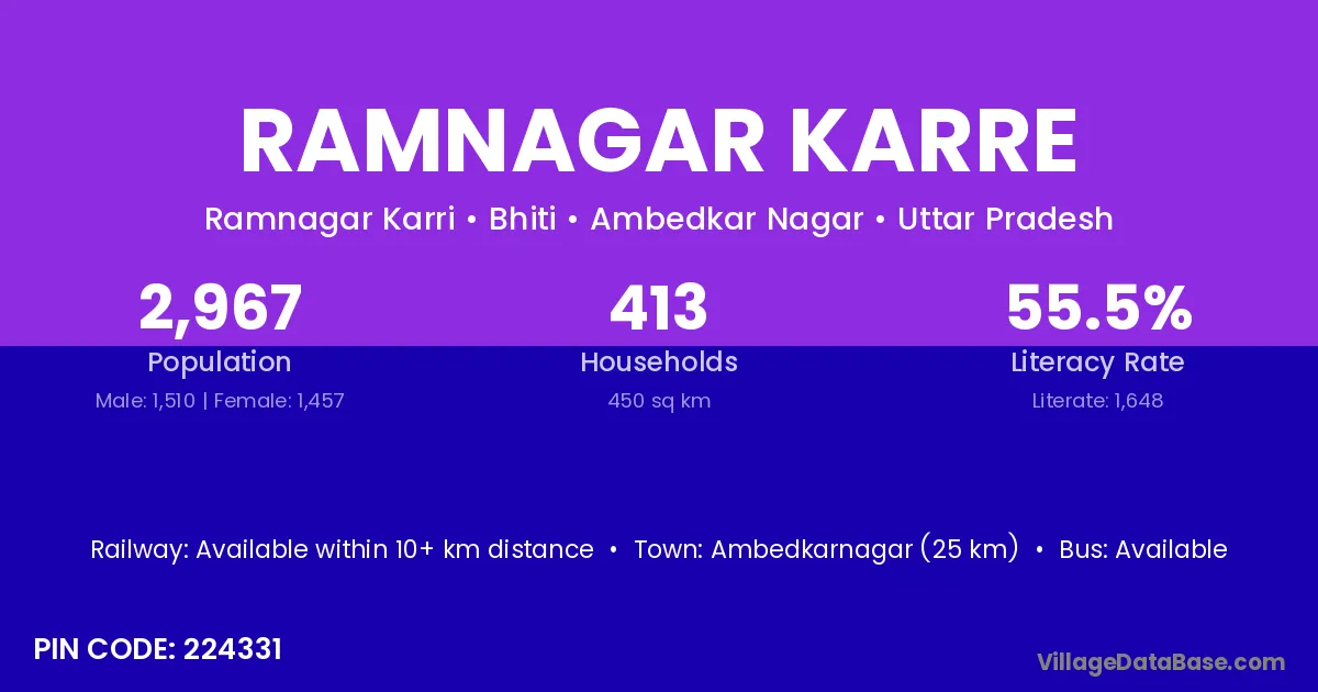 Ambedkarnagar (25 km) is the nearest town to Ramnagar Karre village for major economic activities and is located approximately 25 km away.