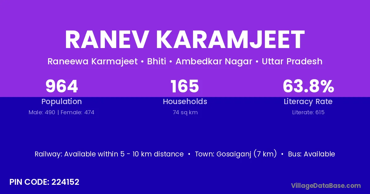 Gosaiganj (7 km) is the nearest town to Ranev Karamjeet village for major economic activities and is located approximately 7 km away.