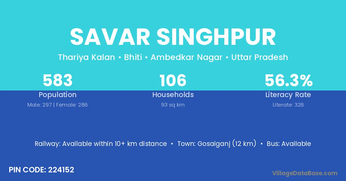 Savar Singhpur village has a total population of 583 people, of which 297 are males and 286 are females.