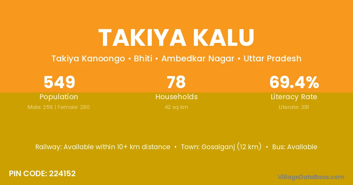 Takiya Kalu village has a total population of 549 people, of which 259 are males and 290 are females.