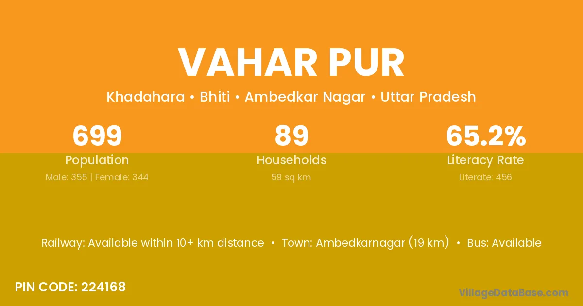 Ambedkarnagar (19 km) is the nearest town to Vahar Pur village for major economic activities and is located approximately 19 km away.