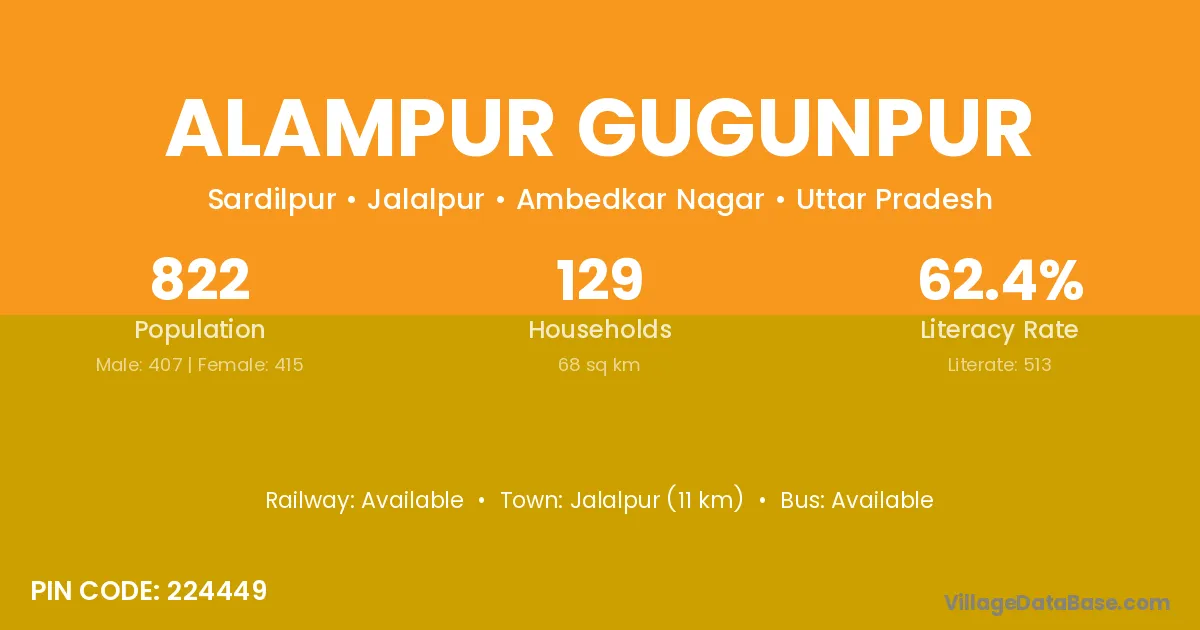 Alampur Gugunpur village has a total population of 822 people, of which 407 are males and 415 are females.