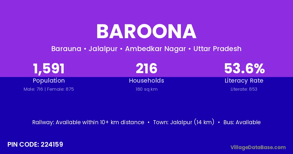 Jalalpur (14 km) is the nearest town to Baroona village for major economic activities and is located approximately 14 km away.