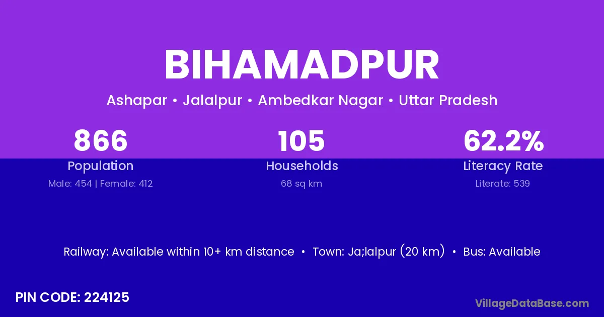 Ja;lalpur (20 km) is the nearest town to Bihamadpur village for major economic activities and is located approximately 20 km away.