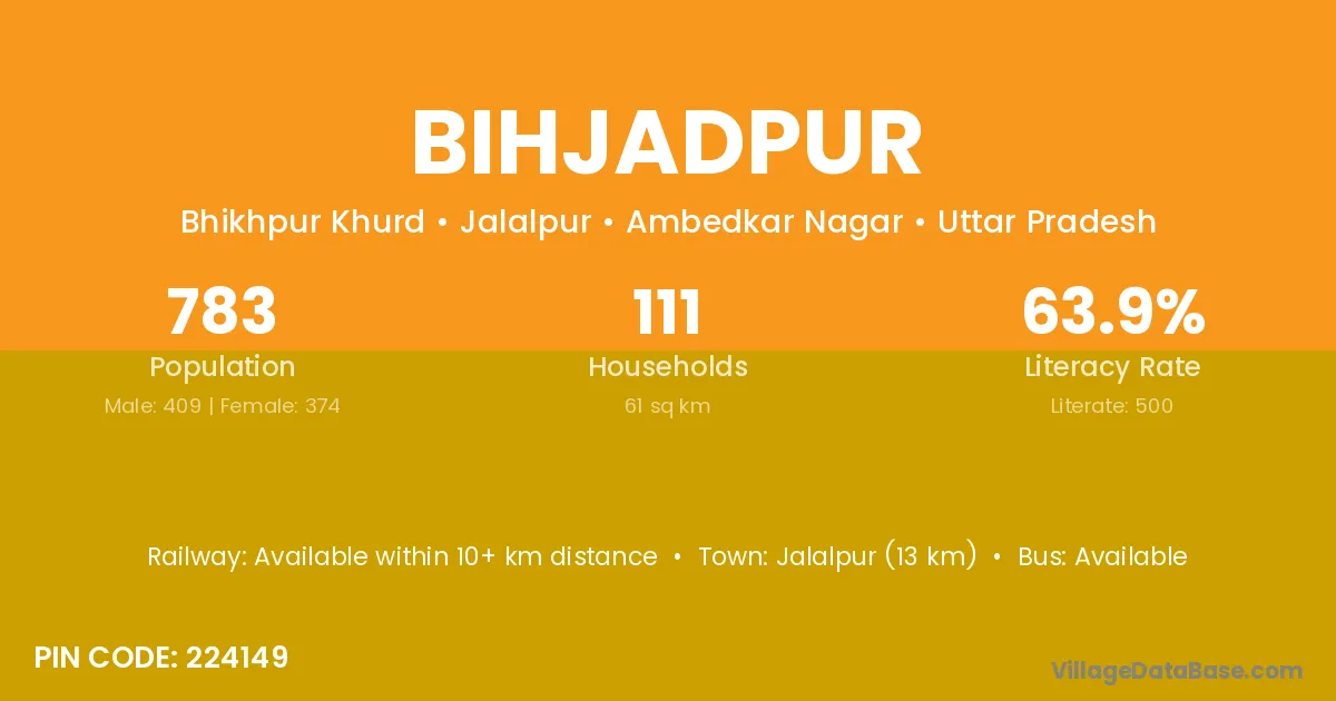 Jalalpur (13 km) is the nearest town to Bihjadpur village for major economic activities and is located approximately 13 km away.