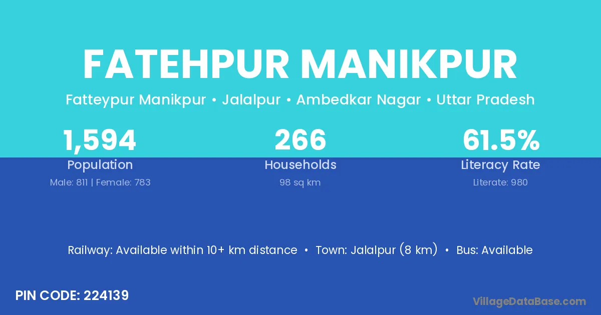 Fatehpur Manikpur village has a total population of 1,594 people, of which 811 are males and 783 are females.