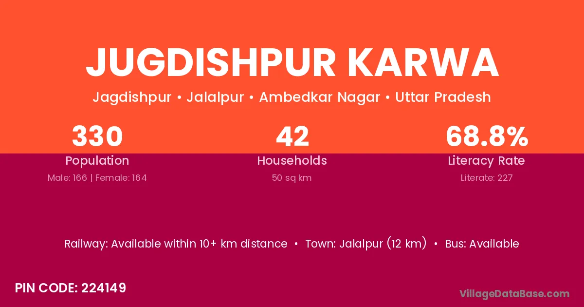 Jugdishpur Karwa village has a total population of 330 people, of which 166 are males and 164 are females.