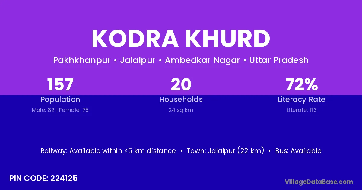 Kodra Khurd village has a total population of 157 people, of which 82 are males and 75 are females.