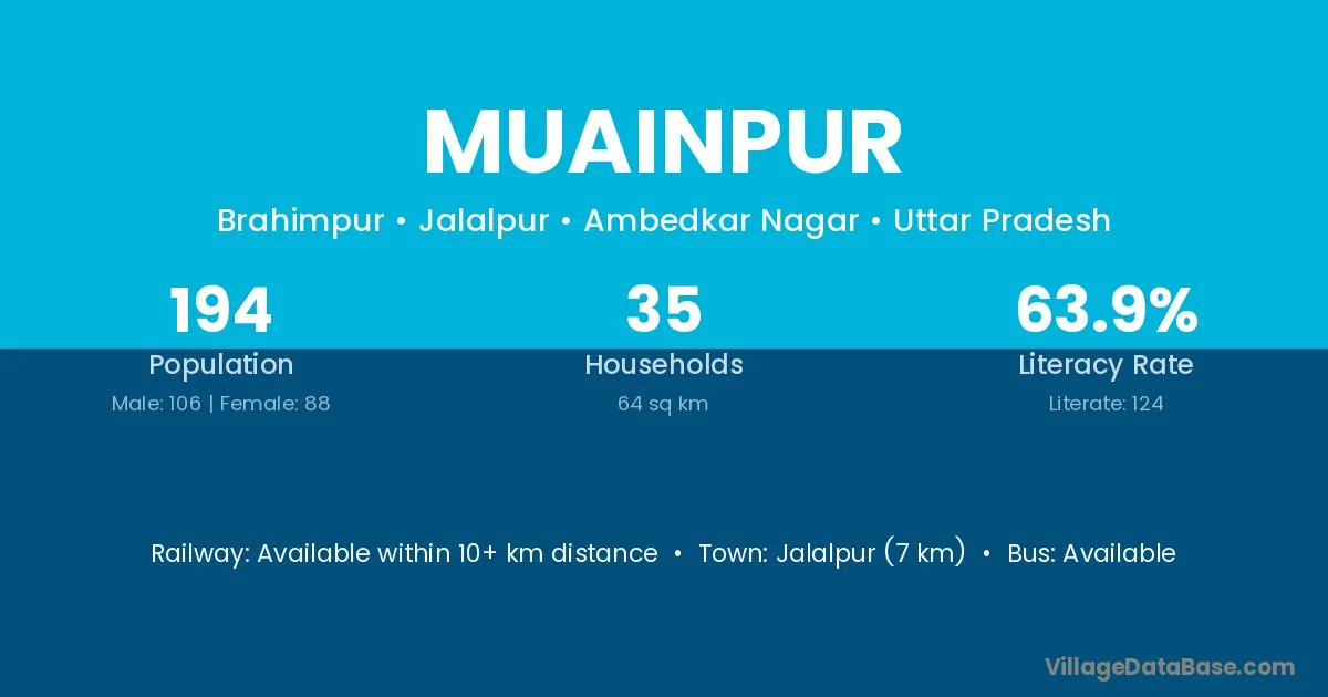 Jalalpur (7 km) is the nearest town to Muainpur village for major economic activities and is located approximately 7 km away.