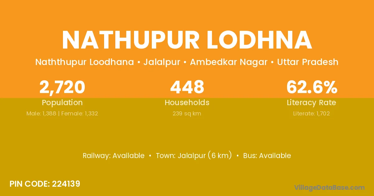 Jalalpur (6 km) is the nearest town to Nathupur Lodhna village for major economic activities and is located approximately 6 km away.