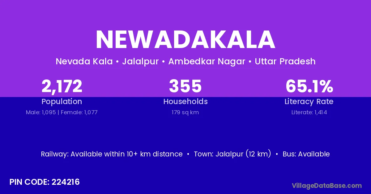 Jalalpur (12 km) is the nearest town to Newadakala village for major economic activities and is located approximately 12 km away.