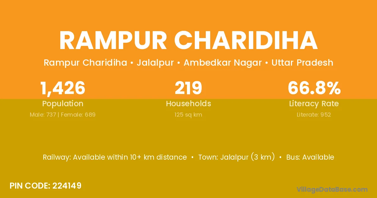 Jalalpur (3 km) is the nearest town to Rampur Charidiha village for major economic activities and is located approximately 3 km away.