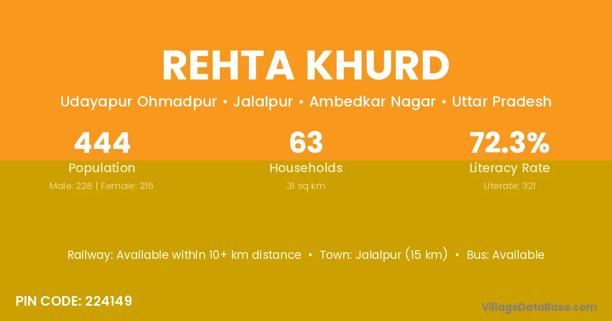 Jalalpur (15 km) is the nearest town to Rehta Khurd village for major economic activities and is located approximately 15 km away.