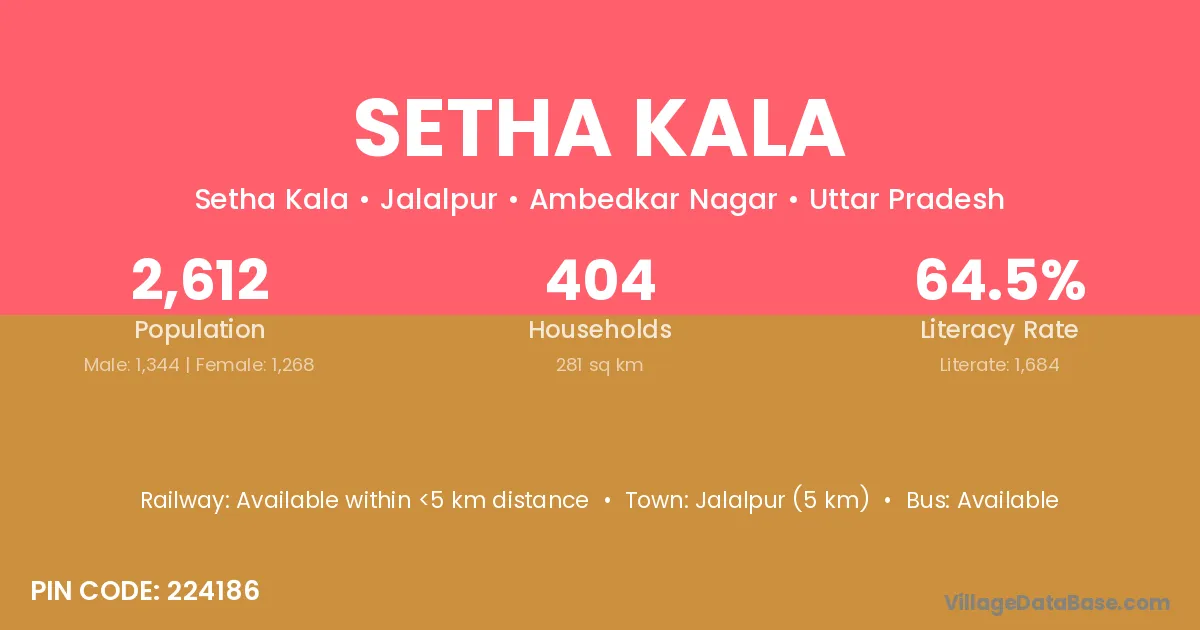 Jalalpur (5 km) is the nearest town to Setha Kala village for major economic activities and is located approximately 5 km away.
