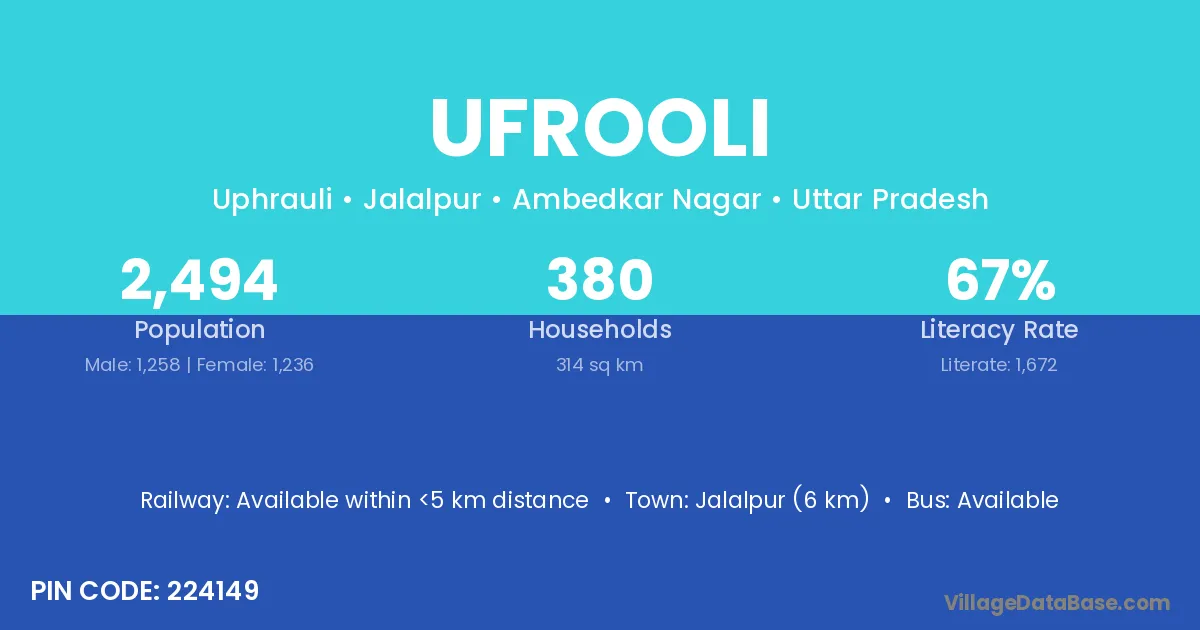Jalalpur (6 km) is the nearest town to Ufrooli village for major economic activities and is located approximately 6 km away.