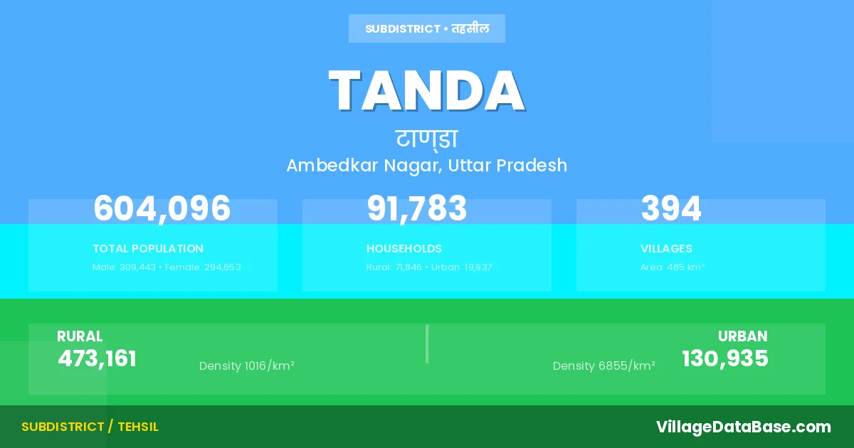 According to the 2011 census The total area of Tanda Tehsil is 485 km², with a population of 604096 people. The population density is 1,246 inhabitants per square kilometre, and there are approximately 91783 houses in the sub district.