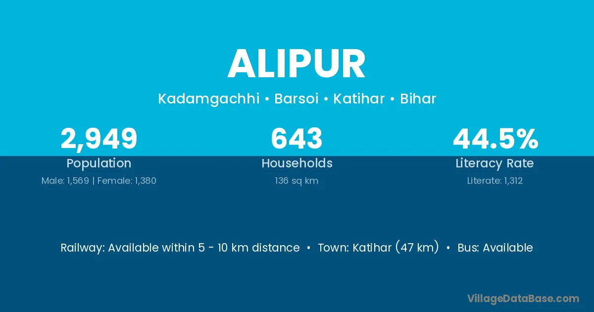 Alipur village has a total population of 55 people, of which 26 are males and 29 are females.