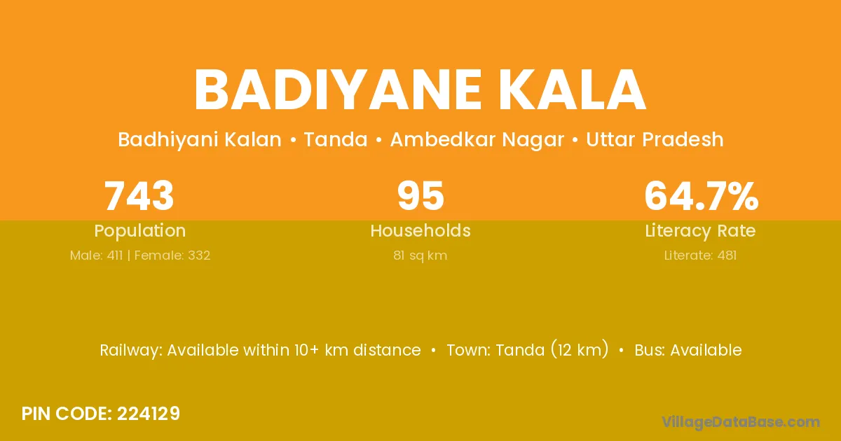 Tanda (12 km) is the nearest town to Badiyane Kala village for major economic activities and is located approximately 12 km away.