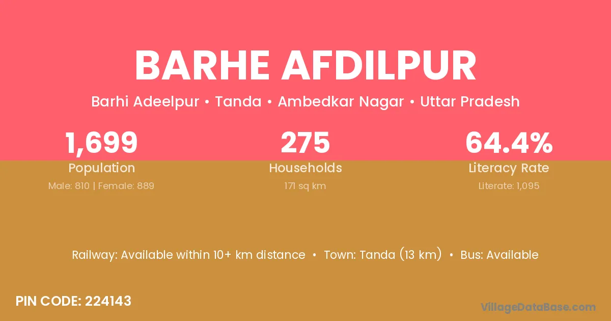 Tanda (13 km) is the nearest town to Barhe Afdilpur village for major economic activities and is located approximately 13 km away.