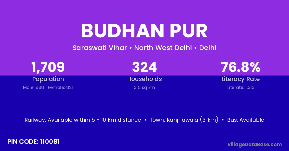 Budhan Pur village has a total population of 829 people, of which 425 are males and 404 are females.