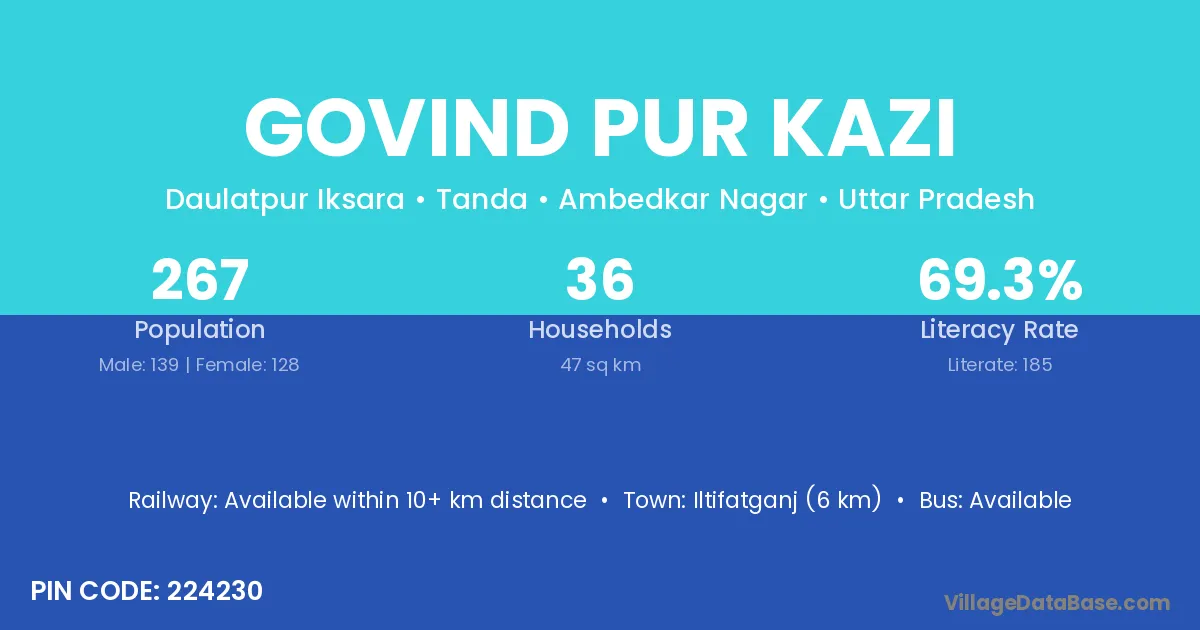 Govind Pur Kazi village has a total population of 267 people, of which 139 are males and 128 are females.