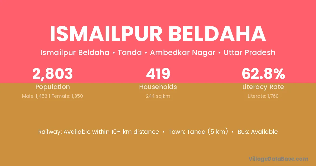 Tanda (5 km) is the nearest town to Ismailpur Beldaha village for major economic activities and is located approximately 5 km away.