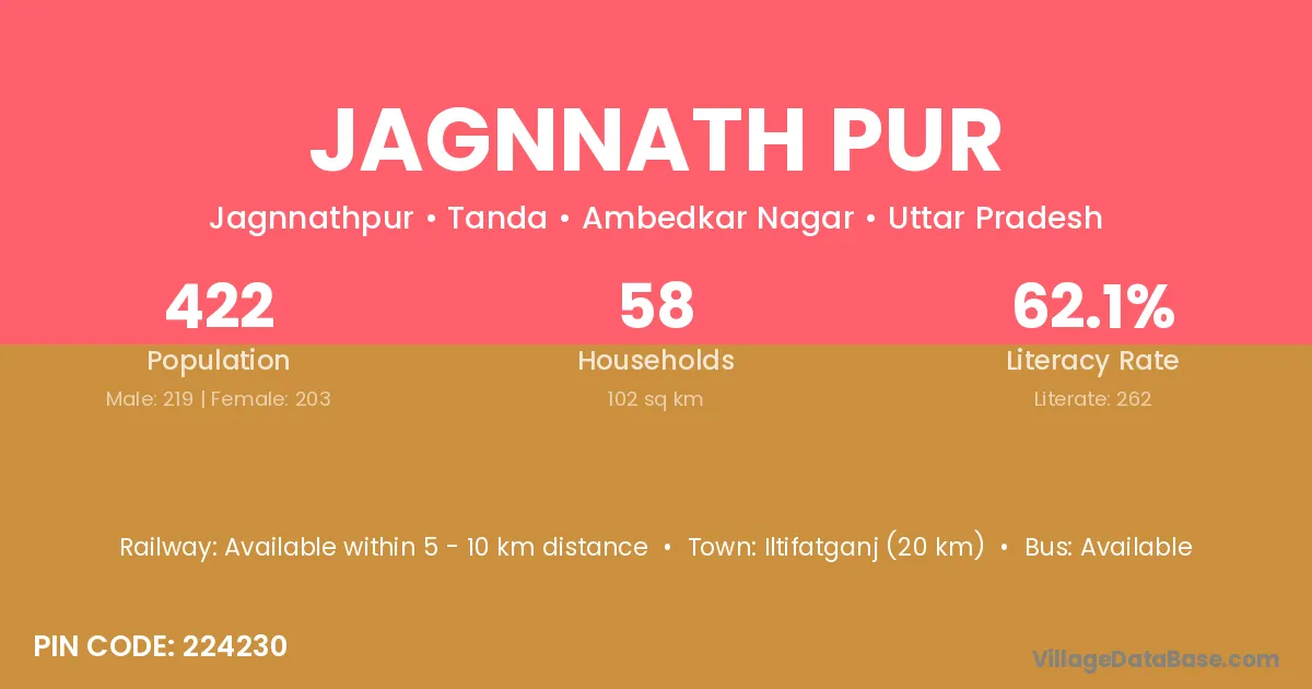 Jagnnath Pur village has a total population of 422 people, of which 219 are males and 203 are females.