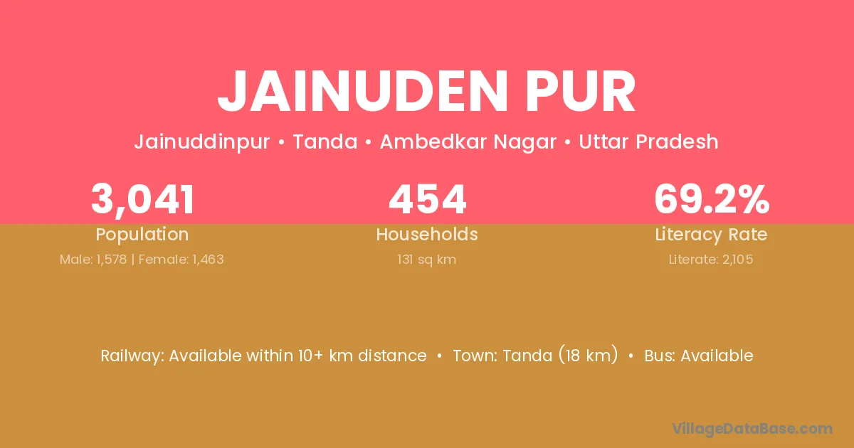 Tanda (18 km) is the nearest town to Jainuden Pur village for major economic activities and is located approximately 18 km away.